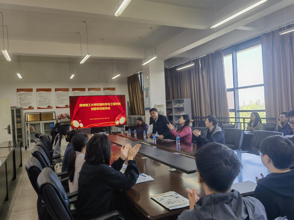 2026年4月1日上午,环境科学与工程学院在环境楼举办云南云测质量检验有限公司专场招聘会。公司总经理钟读波、人力资源部部长郭亚兰、人力资源专员潘蓉亲临招聘会。学院党政领导和负责就业的辅导员老师参加,近50名环境类专业学生到场应聘。