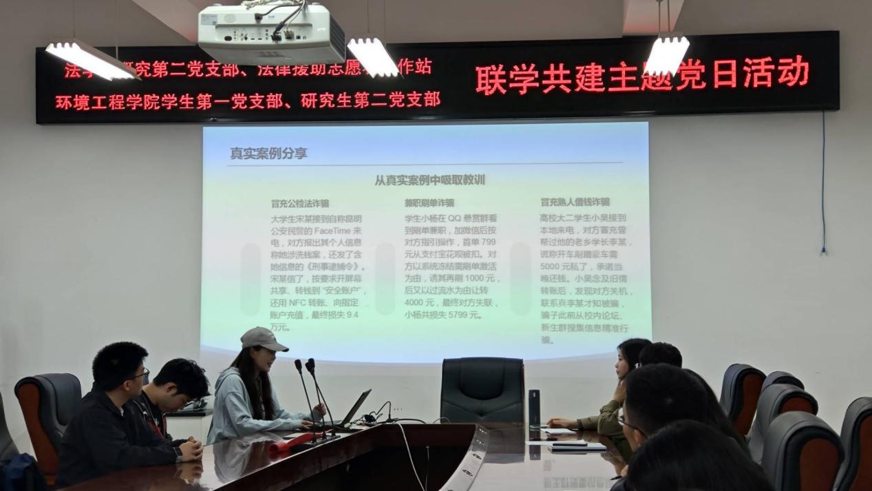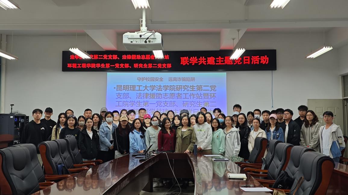 为强化师生反诈防护能力、传承抗战精神、厚植爱国情怀,推动党建与校园安全、红色教育融合,提升党组织凝聚力,2025 年 9 月 26 日 16:30-17:30,昆明理工大学法学院研究生第二党支部、法律援助志愿者工作站,携手环境科学与工程学院学生第一党支部、研究生第二党支部,在明理楼 412 开展“联学共建”主题党日活动。