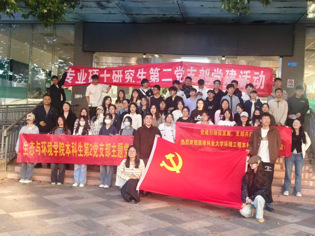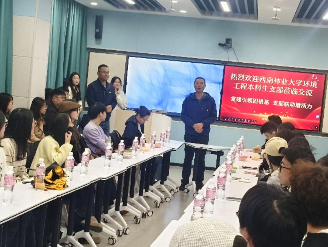 为学习贯彻中国共产党第二十届中央委员会第四次全体会议精神和“十五五”规划建议,以基层党建引领为纽带,深化校际党建合作,凝聚学科发展合力,近日,西南林业大学环境工程本科生党支部与我院专硕研究生第二党支部开展支部联学共建活动,双方支部党员齐聚一堂,以党建学习为抓手,以研讨交流为目标,共同开启校际支部党建联动、强化根基新增活力的新征程。活动伊始,环境学院组织员李晓明老师代表院党委热烈欢迎西南林业大学环境工程本科生党支部全体党员的到来,并讲述了两校携手互助的事迹渊源。他指出,两校在环境科学与工程领域深耕多年,研究方向高度契合,希望以此次活动为契机,搭建常态化交流平台,促进资源共享、优势互补,携手在生态环保领域实现更大突破,为高校服务国家战略需求贡献力量。此次,支部联学共建是深入学习党的二十届四中全会精神及“十五五”规划建议、推动学科协同发展的重要实践。