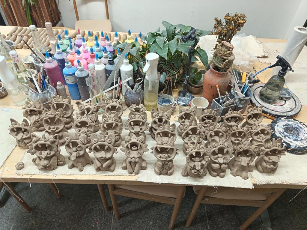 在随后的手工制作环节,同学们在传承人的悉心指导下亲身参与瓦猫制作。传承人首先演示了捏塑、雕刻、打磨等关键步骤与技巧难点,随后在现场进行巡回指导,解答同学们制作中的疑问。在90分钟的创作时间里,同学们全神贯注,将刚刚了解的文化知识转化为手中的艺术创造,一个个形态各异、充满个人巧思的瓦猫雏形逐渐成型。同学们在动手实践中真切体会非遗工艺的精妙,感受传统技艺的匠心与温度。作品将统一上釉烧制,后续在环工楼B200集中展示。活动尾声,全体师生与非遗传承人合影留念。