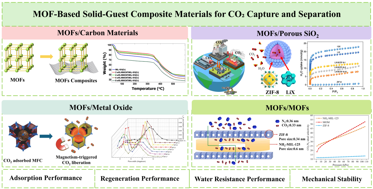 MOFs复合材料凭借其超高吸附容量、优异的吸附选择性和高度可调控性,成为极具前景的CO2吸附剂。此类复合材料有效解决了单一MOF吸附剂在CO2吸附分离中普遍存在的成本高、结构稳定性不足、气体传质效率低、对湿度敏感等共性问题。