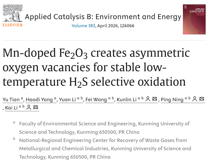近日,环境科学与工程学院宁平、李凯教授团队在工业尾气净化及资源化领域取得重要研究进展,相关成果以“Mn-doped Fe2O3 creates asymmetric oxygen vacancies for stable low-temperature H2S selective oxidation”为题,发表在环境与能源催化领域国际权威期刊《Applied Catalysis B: Environment and Energy》上。