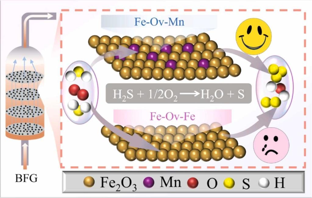 调控催化剂的微观结构对其催化活性和稳定性有着深远影响。本研究用一种精确调控Fe2O3微观结构的策略,实现了将Fe2O3由吸附剂转化为高效-稳定的硫化氢选择性氧化催化剂。基于Fe与Mn原子半径和物理化学特性接近的原理,使用Mn掺杂Fe2O3合成了具有丰富表面非对称氧空位的催化剂。该方法使Mn物种可以完整嵌入Fe2O3晶格形成非对称的Fe-O-Mn结构,进而导致非对称Fe-OV-Mn结构生成,显著提升了催化剂的氧活化性能,进而实现高效稳定的硫化氢选择性氧化。值得注意的是,通过调控Mn掺杂量可以精确调控催化剂的氧化性能,以满足不同氧化反应的需求。